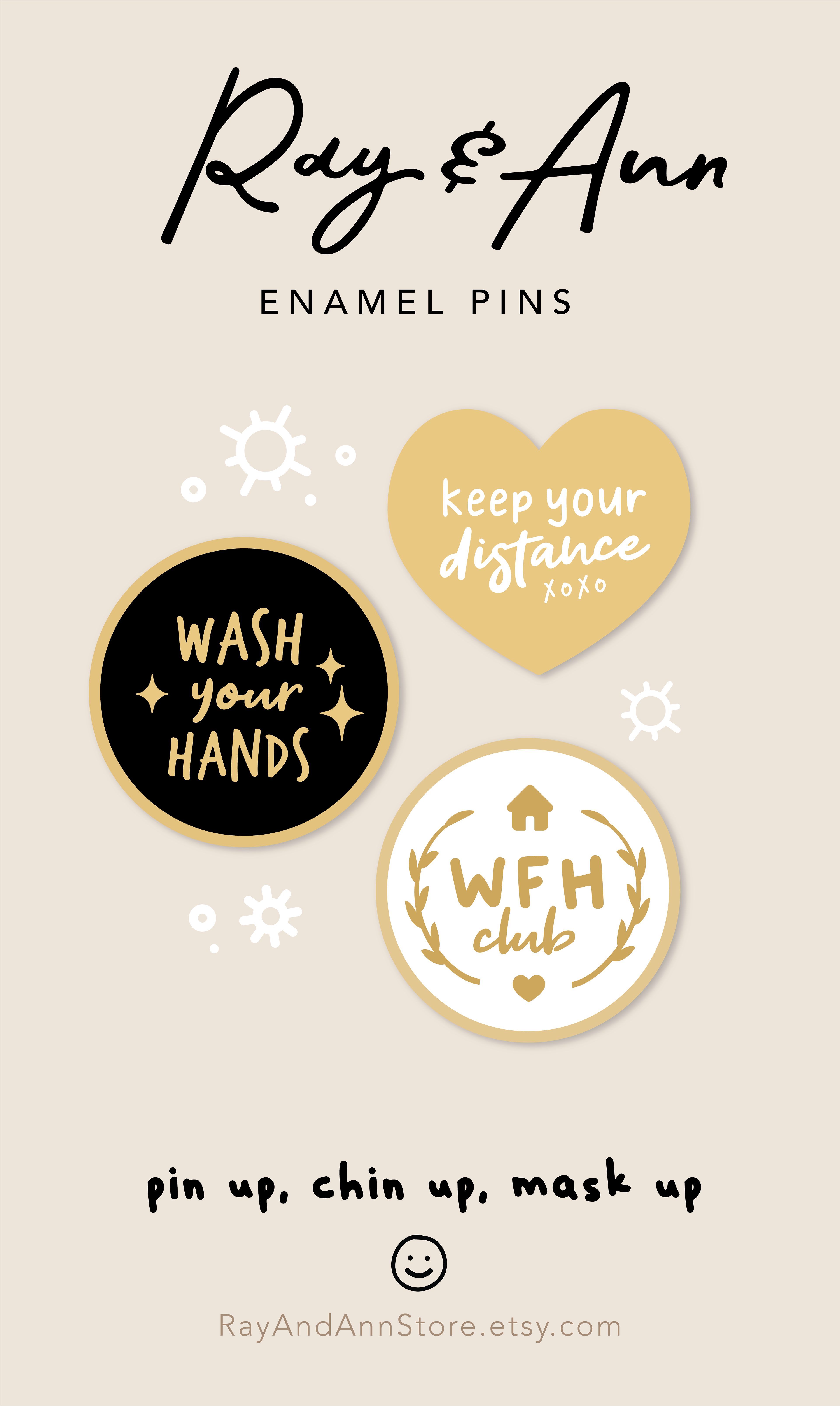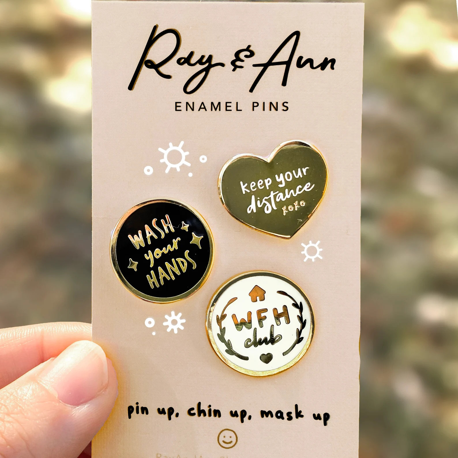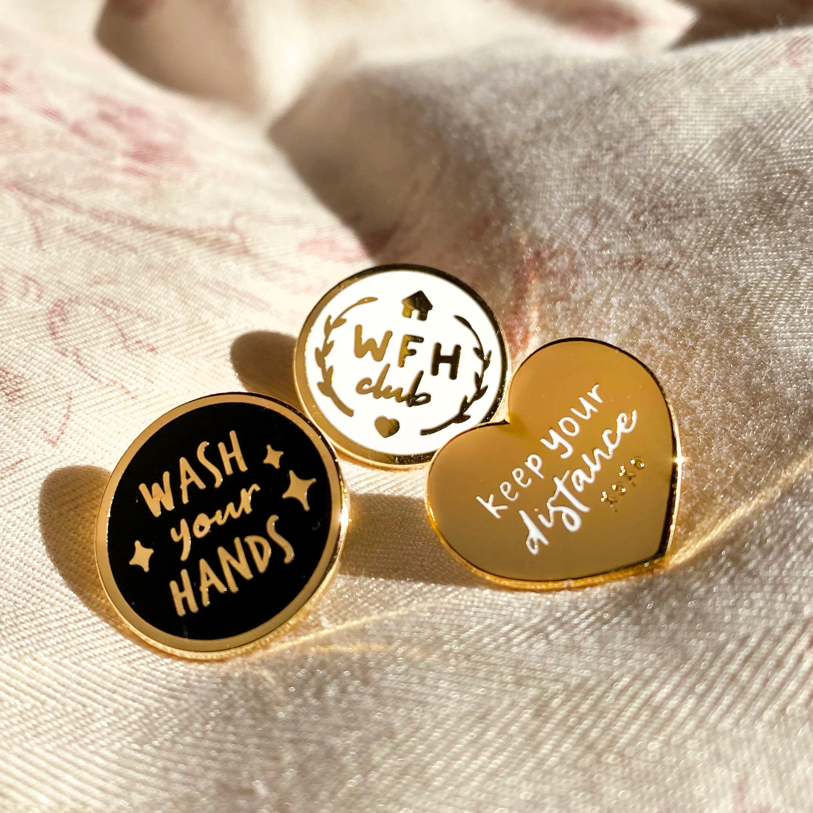 Enamel pins that offer a lighthearted means to spread smiles and raise awareness amidst the pandemic
